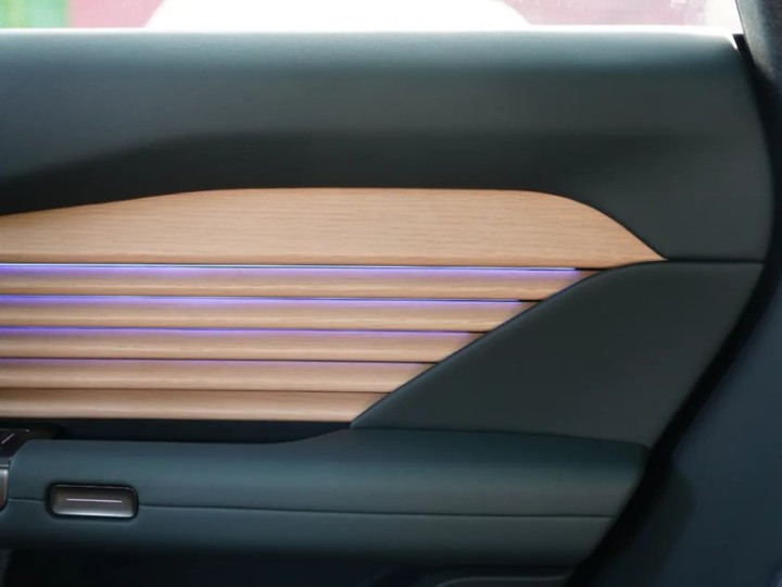 比如副中控台和四门上,大面积使用的北美进口橡木/栗木饰板,以及隐藏在木饰中“见光不见灯”的氛围灯带设计: