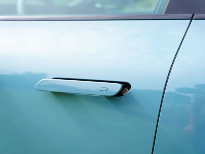 奥迪E5 Sportback的隐藏式门把手内侧,前排是带电容感应的。只要手碰到,车门就会自动解锁弹开,但后排没有。